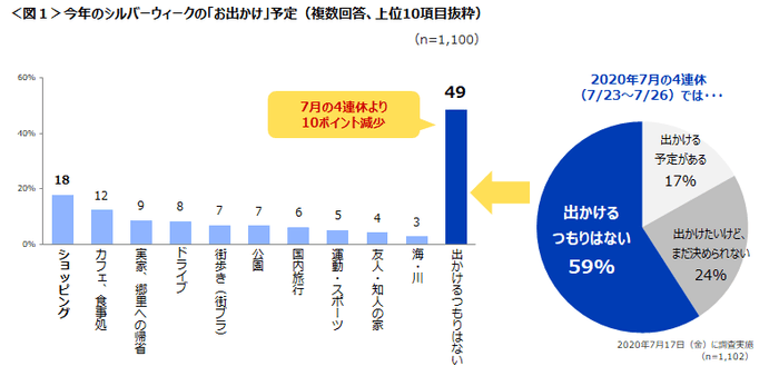 「出かけるつもりはない」が49%と半数近くを占めたものの、7月の4連休(7月23日~7月26日)に関する調査に比べると10ポイント減少。徐々に外出自粛のムードが緩和され、お出かけ意向が回復している様子が窺える。<図1>