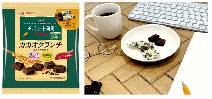 カカオクランチは、板タイプの高カカオチョコレートが苦手な方にもオススメしたい商品を開発できたと考えております。今後も、より多くの方にカカオポリフェノールをおいしく楽しく継続的に摂取いただけるような新しいラインアップの開発を日々進めております。明治チョコレート効果の今後にぜひご期待ください。