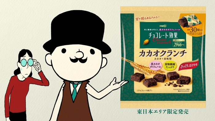 10月1日(火)より、WebCMチョコレート効果 「カカオクランチ新発売」篇を公開します。帽子を被り、立派なひげたくわえた“チョコ先生”がアニメーションになって登場。健康とおいしさ、健康とお菓子っぽさの両立は難しい、という先入観をチョコ先生が壊していきます。「チョコレート効果 カカオクランチ大袋」の特長である、高カカオなのに、サクッとした食感を表現したCMです。
