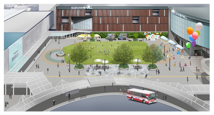 樟葉駅前広場(ハピネスパーク KUZUHAグラススクエア※1)にて天然芝生や壁面緑化など、緑あふれる憩いと賑わいの駅前空間を作る工事が進行中。隣接する KUZUHA MALL では、駅前広場に面した本館ハナノモール 1F の壁面にグリーンウォールを形成し、商業施設と公共空間が一体となり滞在しやすい駅前空間を創出します。