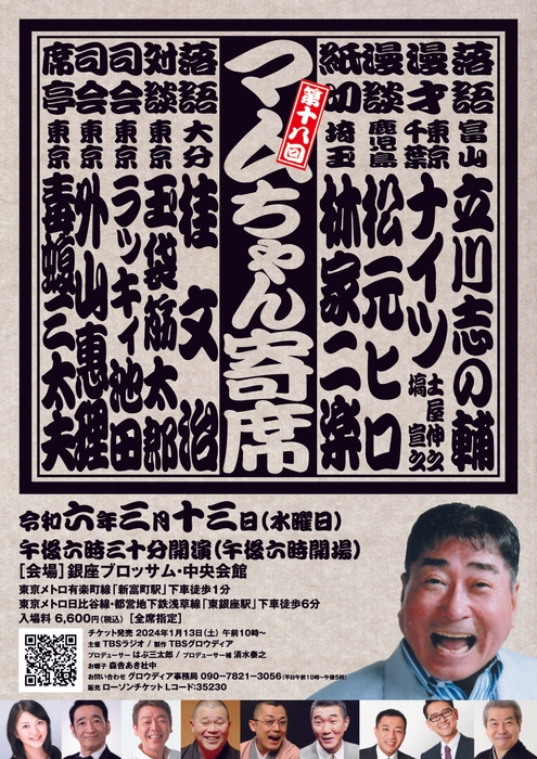 株式会社TBSグロウディア(東京都港区、代表取締役:園田憲)は、第18回マムちゃん寄席の製作を担当し開催を決定しました。