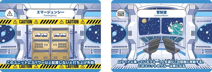 カードの効果によって状況が目まぐるしく変化する、カジュアルに遊べるエリアマジョリティゲームです。部屋に異常事態が起きたらさあ大変!クルーをロケットに配置したり、カードを使ってロケットに部屋を設置したりと出発前の宇宙船内は大騒ぎ!