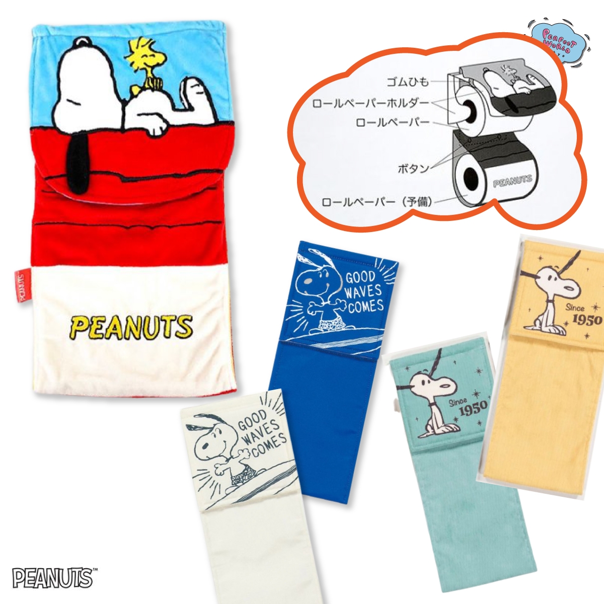 トイレのフタカバーやマットなどをお使いの方にお知らせです。スヌーピーからとってもキュートでカラフルな、トイレットペーパーホルダーカバーが入荷しました。カバーを変えるだけで、一気に明るく楽しい空間になること間違いなしのアイテムです。ぜひご覧ください。