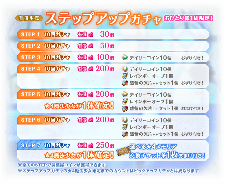 ※STEP5、STEP7での★4魔法少女について、ピックアップ対象の魔法少女が確定するわけではございません。
