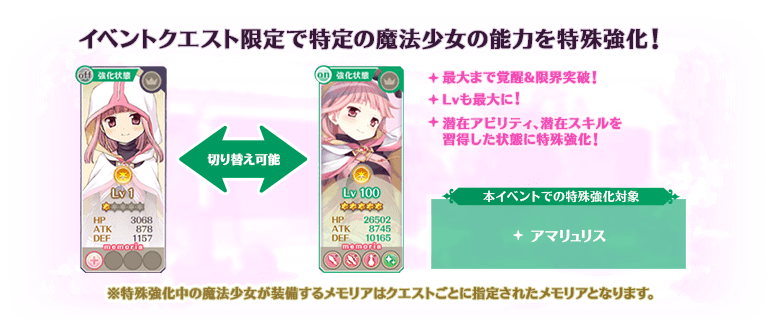対象の魔法少女を編成して本イベントクエストをプレイする際に、ステータスを特殊な状態に強化することができます。