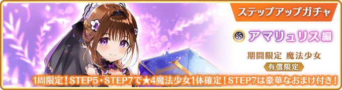 ・同時開催の『有償限定 ステップアップガチャ アマリュリス編』での★4魔法少女1体確定までのカウントは、『期間限定 アマリュリス ピックアップガチャ』には引き継がれません。