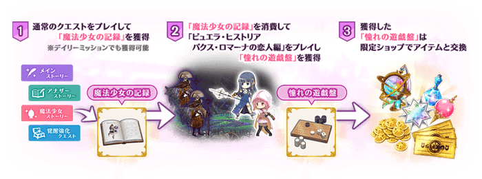 「魔法少女の記録」を消費すると本イベントのクエストをプレイでき、限定アイテムや覚醒素材と交換できる「憧れの遊戯盤」を獲得できます。