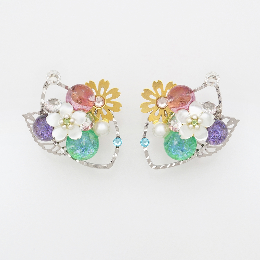 京都の自社工房にて職人が一粒一粒丁寧に焼き上げたヴェネチアンガラスをベースに焼き上げた「京ガラス」を使用し、繊細なパーツやモチーフと組み合わせ、おもわず目を惹くような絢爛豪華なデザインに仕上げました。すべての工程を京都の工房で手作りしています。