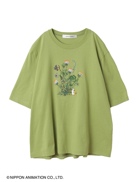 ボトムとのバランスがとりやすい緩いAラインのTシャツ。大きなシロツメクサを見上げるラスカルの愛らしい表情を、国内生産ならではの贅沢な12色の色糸の刺繍で表現しました。SUPER HAKKA定番の30/-天竺を使用しており、前後差をつけてラウンドさせた後ろ裾が、サイドからのきれいなシルエットを作り出してくれます。