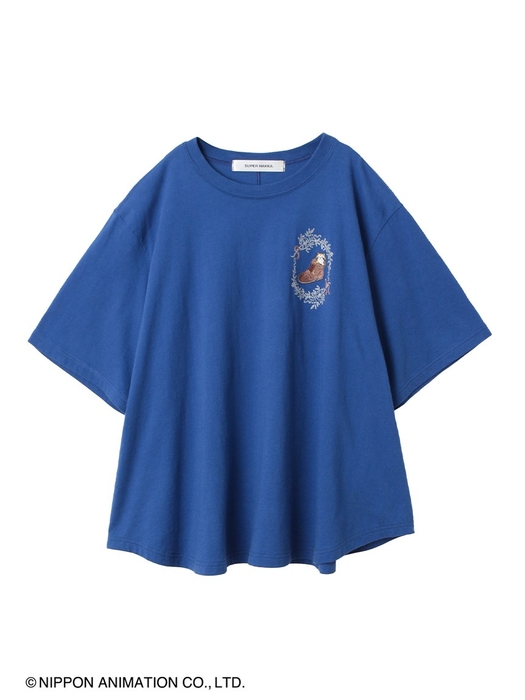 ブーツから顔を出したなんとも可愛い表情のラスカルのモチーフを、刺繍で胸元に施したフレアTシャツ。ボディラインを拾いすぎない程よくフレアなシルエットで、女性らしい柔らかい雰囲気を演出してくれます。クラシカルな蔦のフレームに見えるさりげないSHの文字がポイントです。