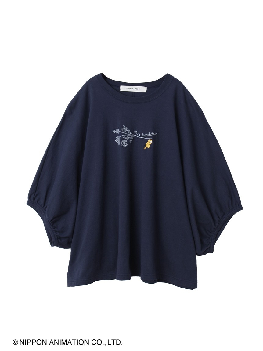 ラスカルとお花の刺繍を施した、ボリュームのあるドルマンスリーブTシャツ。SUPER HAKKAらしい線画のお花の先には、ラスカルがぶら下がっています。程よい丈感でボトムを選ばずスタイリングしていただけます。