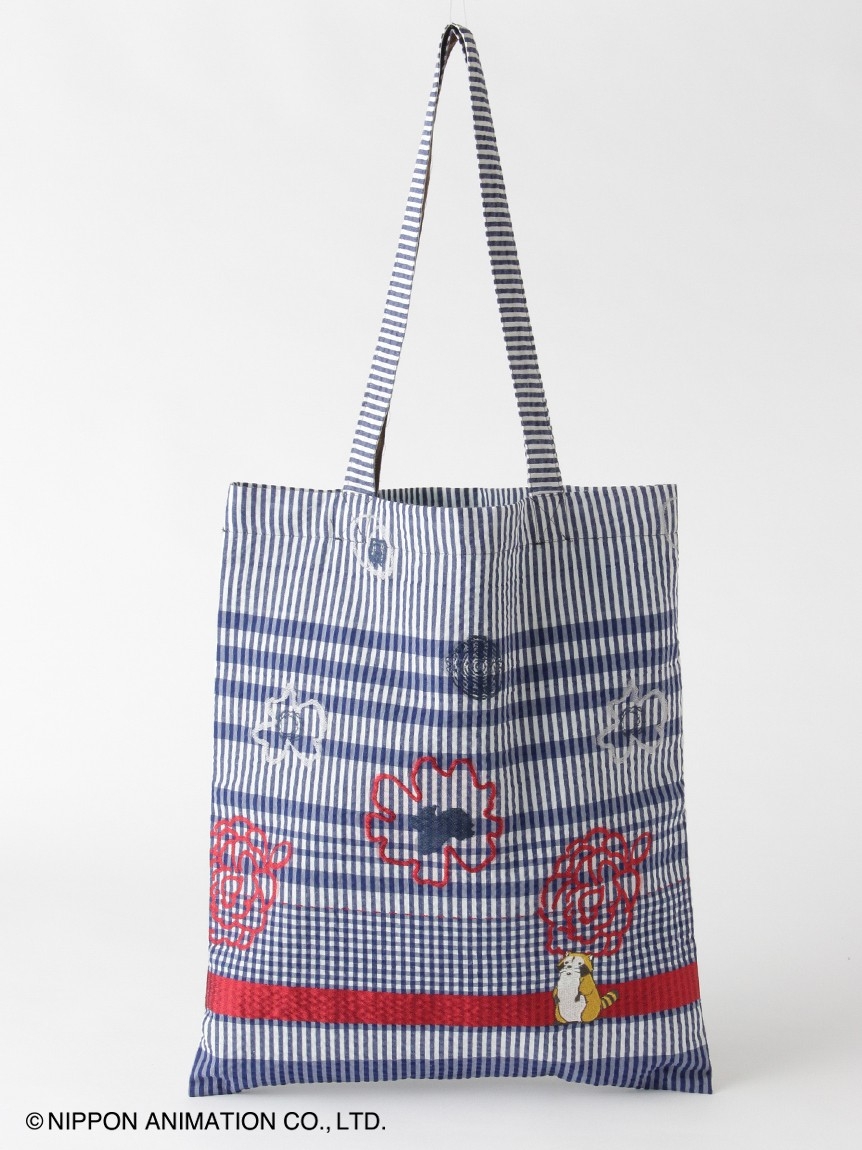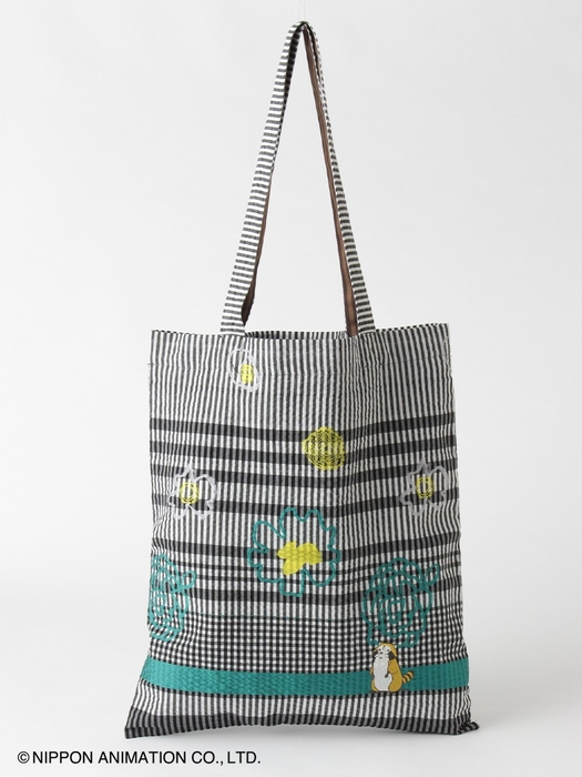 SUPER HAKKAアーカイブのアートフラワージャカード生地を使用したトートバッグ。ジャカードの柄の中には、こちらを見つめる可愛らしいラスカルの刺繍を施しました。A4サイズが入る大きさで、内側にはミニポケットを付け、機能性にもこだわったアイテムです。