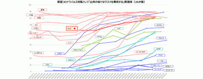 今年の4月、新型コロナウイルスの感染拡大に伴い日本人の公共の場でのマスク着用率は81%を占めていました(グラフ参照:調査実施機関 日本リサーチセンター)。また、マスク不足により布マスクの普及やマスクを繰り返し洗って使うケースが増え、マスクの衛生管理への意識も高まっていきました。そこで当社は衛生意識の高い日本のマスク使用者に向けて、2000年から開発している安定化二酸化塩素※の除菌・消臭技術を応用し、スプレーや機械的な装置を使わず手軽に使えるマスク用除菌・消臭剤を開発いたしました。