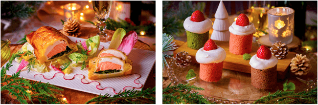 他にもサーモンのピンクとほうれん草のグリーンのコントラストと、バターたっぷりのパイ生地のリッチな味わいが楽しめる「サーモンのパイ包み焼き」、真っ赤ないちごを炎に見立てた「クリスマスキャンドルケーキ」も登場し、クリスマス気分を盛り上げます。