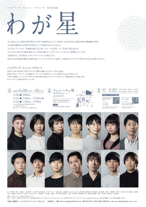 ジャグリング・ユニット・フラトレス(代表:宮田直人) 第6回公演『わが星』が2022年5月20日 (金) ~2022年5月22日 (日)にフェニーチェ堺(堺市民芸術文化ホール)大スタジオ(大阪府堺市)にて上演されます。チケットはカンフェティ(運営:ロングランプランニング株式会社、東京都新宿区、代表取締役:榑松 大剛)にて2月23日(水)より発売開始です。