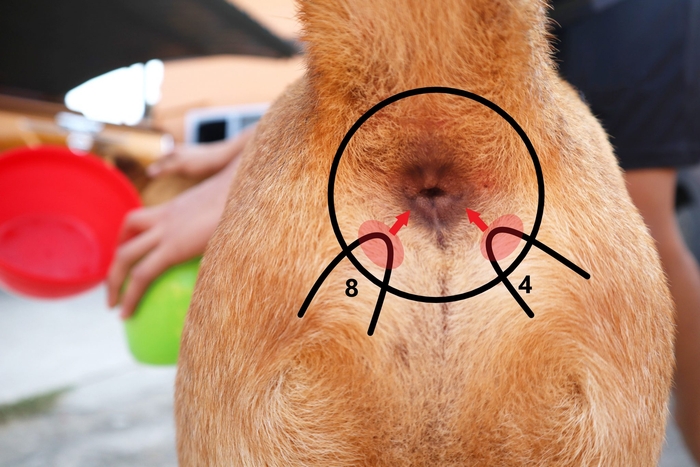 ①時計の4時と8時の位置に指を置きます。指は親指と人差し指がやりやすいです。