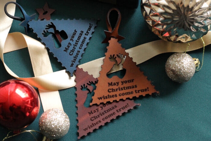 Munekawaは、環境に配慮するためラッピングや梱包資材も可能な限りリサイクルされた物や繰り返し使い続けやすい物を選択しています。革のオーナメントも端材を使い、長年飾っていただけるように製作しました。