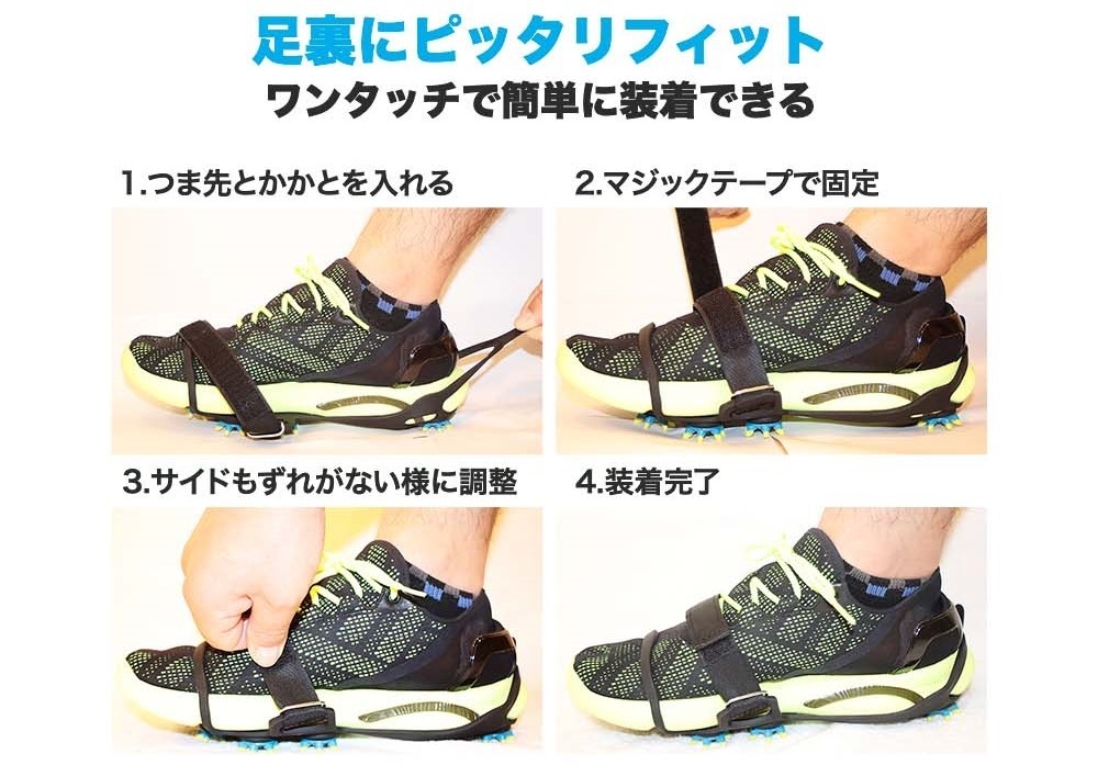 本製品は、今までになかった発想でスニーカーや運動靴の上から履くだけで簡単にゴルフシューズにすることができるのが大きな特徴です。