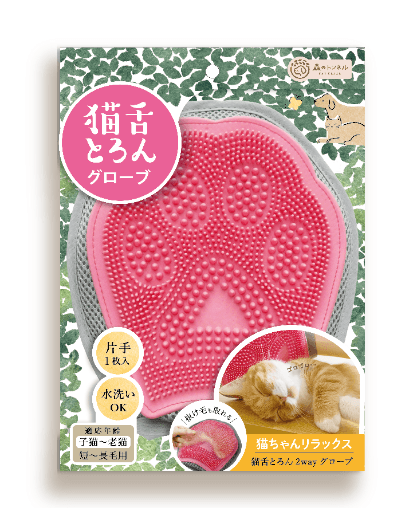 「猫舌とろん2wayグローブ」はグローブ表面にシリコンのブラシがついていて、手にはめてなでなですることでブラッシングができるアイテムです。