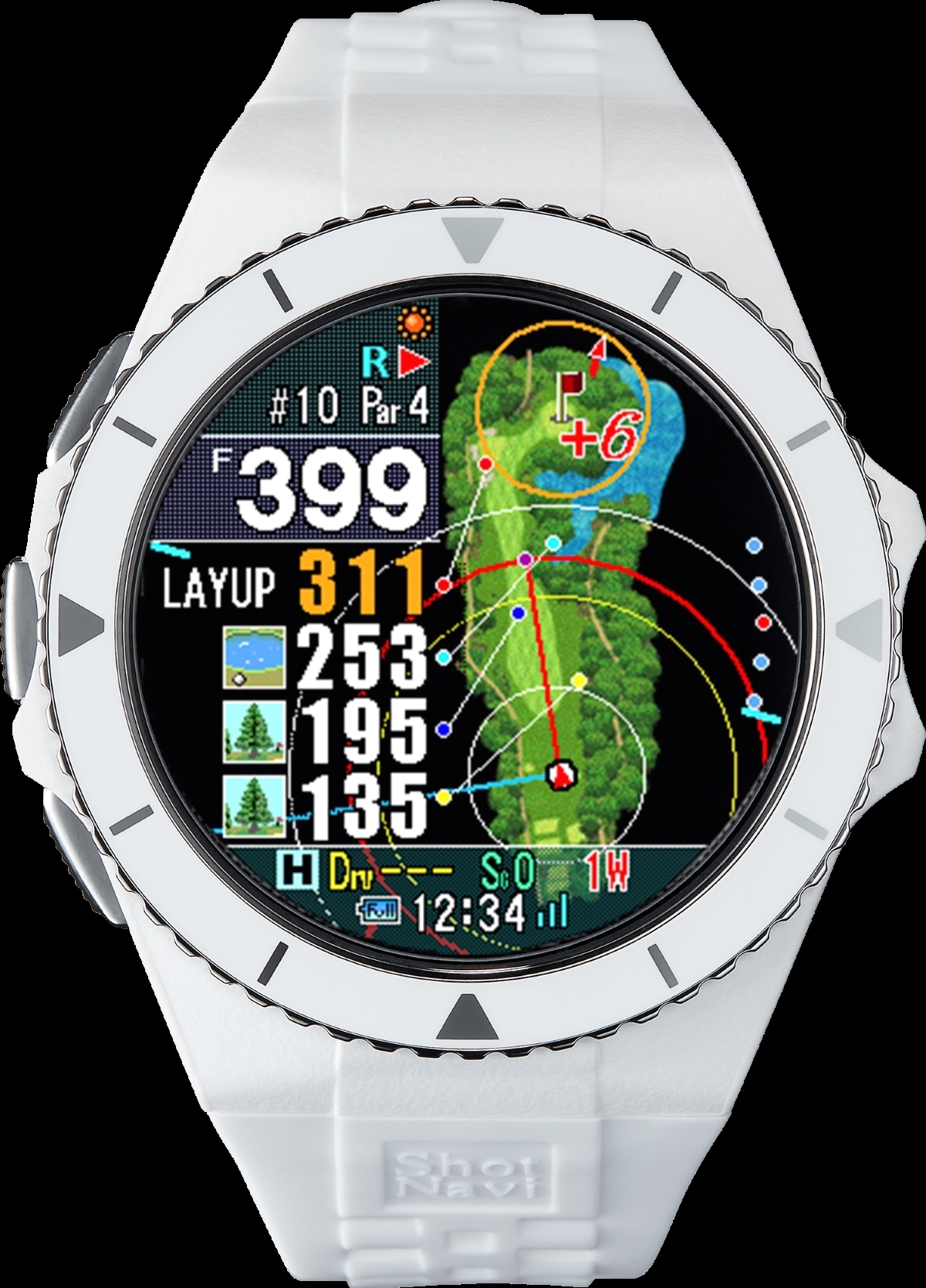 本製品はショットナビ腕時計型GPSナビの最上級モデルとして、1.4inchタッチパネルディスプレイにセラミック素材をベゼルに採用し、耐久性が保たれながらも装着感と操作性の向上を目指しました。グリーンの起伏が一目で把握できるDynamic Green Eyeに傾斜を直観的に理解できる矢印が表示されるスロープディレクションを追加。また、プレー中の気温を考慮した目安距離を表示するテンプアジャストやスイングテンポの計測を可能にした機能も搭載し充実を図っています。あなたのスコアアップに是非お役立てください。