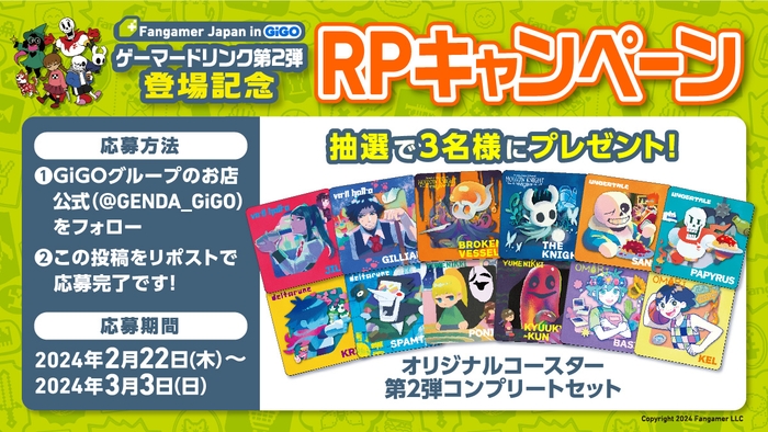 X(旧Twitter)アカウント(https://twitter.com/GENDA_GiGO)をフォローの上で、該当の投稿をリポストくださったお客さまの中から抽選で3名様に「オリジナルコースター第2弾コンプリートセット(全12種)」をプレゼントいたします。