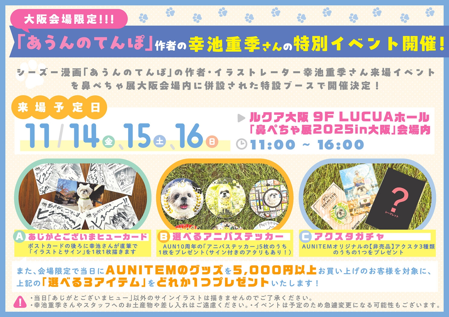 シーズー漫画「あうんのてんぽ」の作者・イラストレーター幸池重季による来場イベントも開催決定!イベント当日は、本人との交流のほか、AUNITEMのグッズ5,000円以上ご購入の方を対象に、選べる大阪限定アイテムをプレゼントいたします!