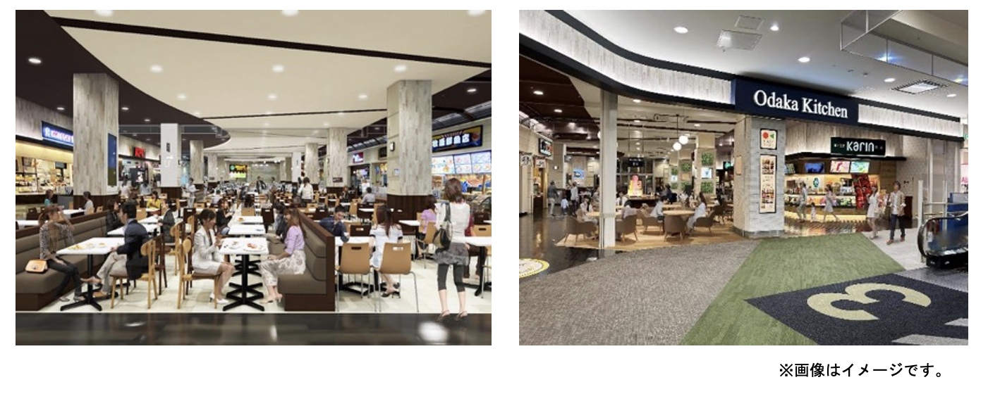 ・3Fフードコートは、座席数を約1,000席から約1,200席に拡大するほか、ご家族でご利用いただける小上がり席を新設します。また、開放感を感じられるテラス席のリニューアルを実施します。
