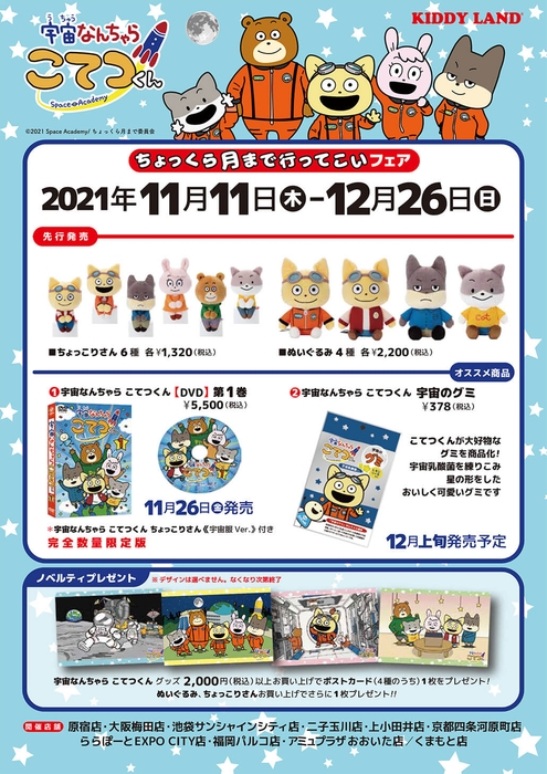 キデイランド10店舗では、『宇宙なんちゃらこてつくん』に先行販売商品であるタカラトミーアーツのちょっこりさんやぬいぐるみをご用意。期間中に発売されるアニメのDVDをはじめ、こてつくんが大好きな宇宙グミも販売いたします。