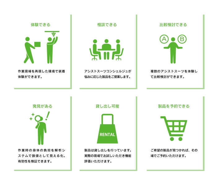 ここでは、腕上げ作業や立ち作業、重量物の持ち上げ、移乗介助などの体験ブースがあり、現場に近いリアルな環境で装着・体験していただくことで、お客さまに寄り添うアシストスーツとの出会いをサポートします。