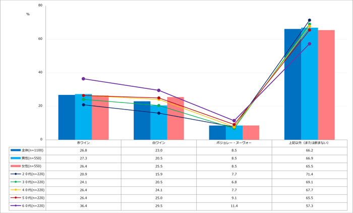 また、ワインを飲んでいる人に購入場所を聞いたところ、「スーパー」が68.0%で最も多くなっていました。「ネット通販」は60代が多く利用しており、28.7%の人が購入場所として回答していました。「コンビニ」は20代、30代での利用が多く、20代は27.0%、30代は27.9%で約3割の人が購入場所として上げていました。