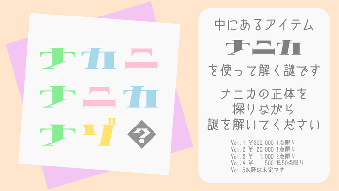 同封されたアイテムを使って解く謎なのに、そのアイテムがわからない!?この謎は、アイテムの正体を特定しないと解けない。アイテムの正体が何かを探りながら謎を解いていこう。恐らく持ち帰り謎史上最高額の30万円。一点限りのプレミア品となります。