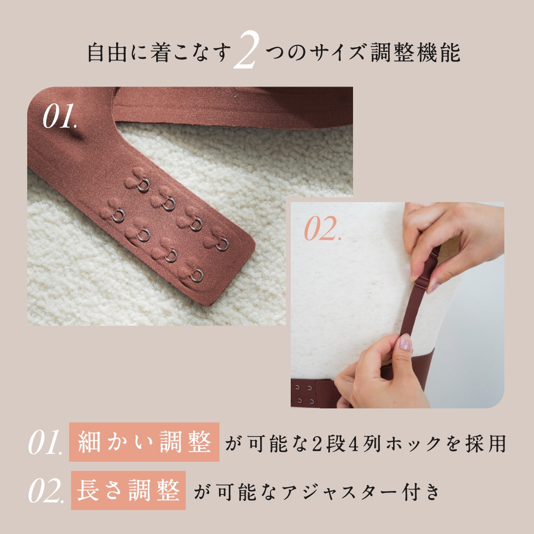 また、長さ調節が可能なアジャスター付きなのでバストの位置や食い込みがきつい時などの繊細な悩みにも寄り添って調整することができます。