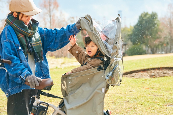 ファスナーレスを実現し、子どもの乗せ降ろしをラクに オールシーズン活躍の自転車チャイルドシート用レインカバー新発売