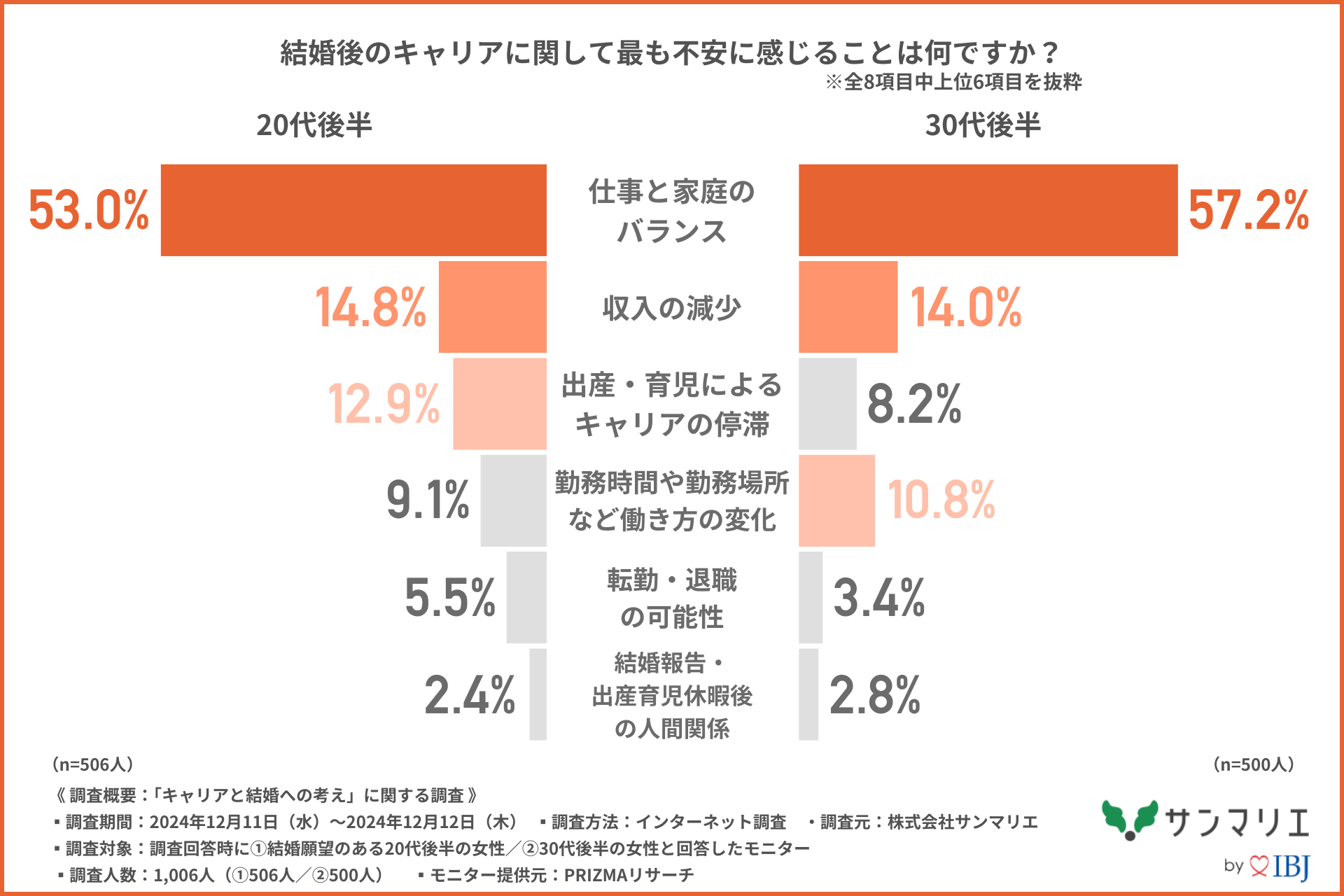 結婚後のキャリアに対して不安に感じることは20代後半、30代後半ともに『仕事と家庭のバランス』と判明!
