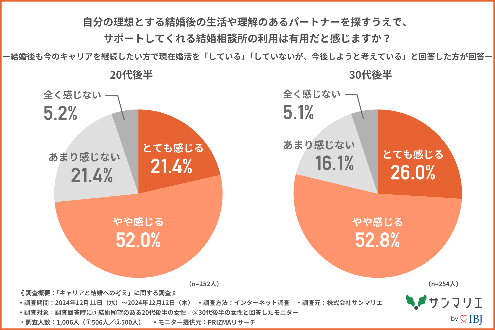 20代後半、30代後半の方ともに約7割以上が結婚相談所のサポートに対して有用性を感じていることがわかりました。