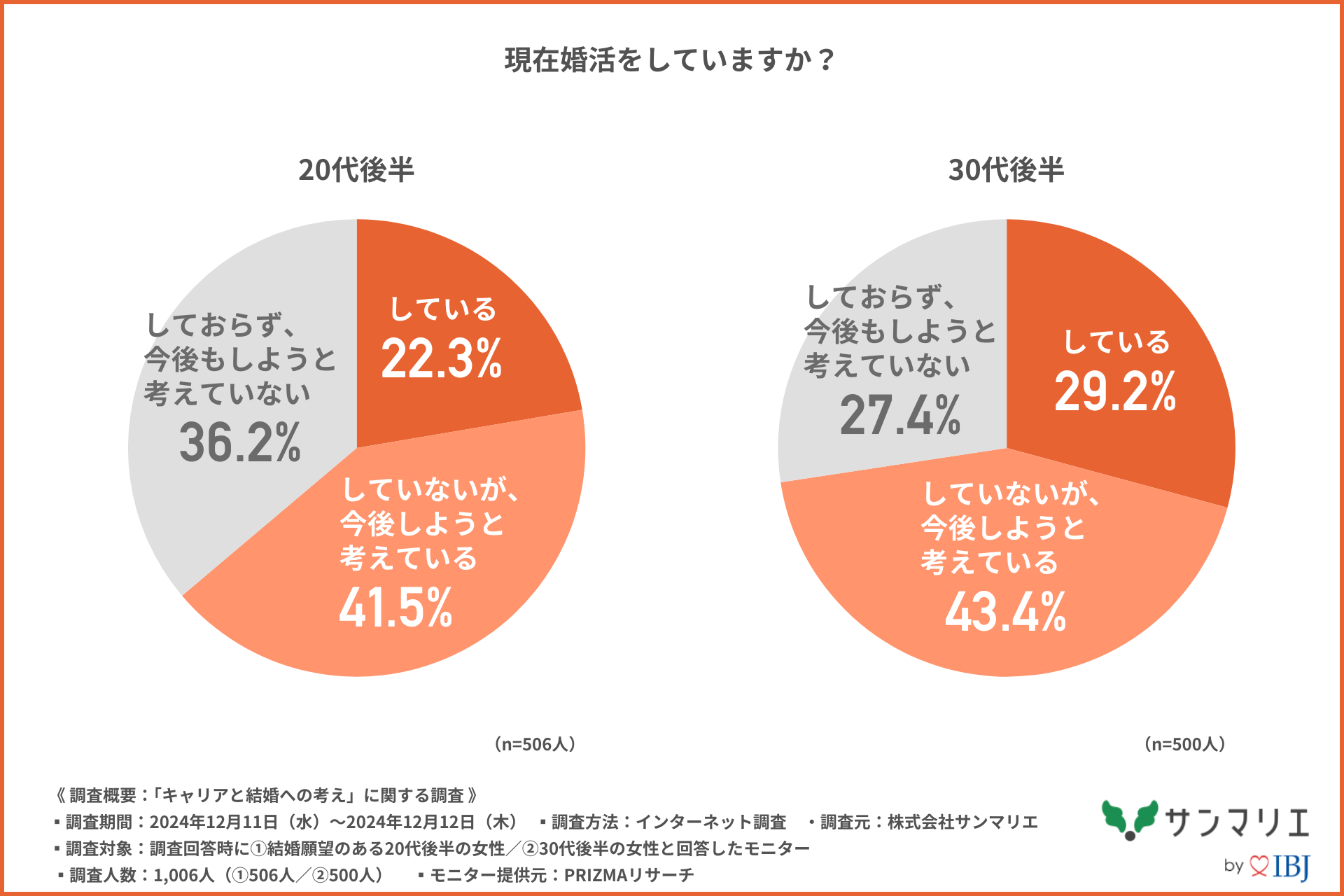 そこで今回、株式会社サンマリエ( https://www.sunmarie.co.jp/ )は、(1)結婚願望のある20代後半の女性506名/(2)30代後半の女性500名を対象に、「キャリアと結婚への考え」に関する調査を行いました。