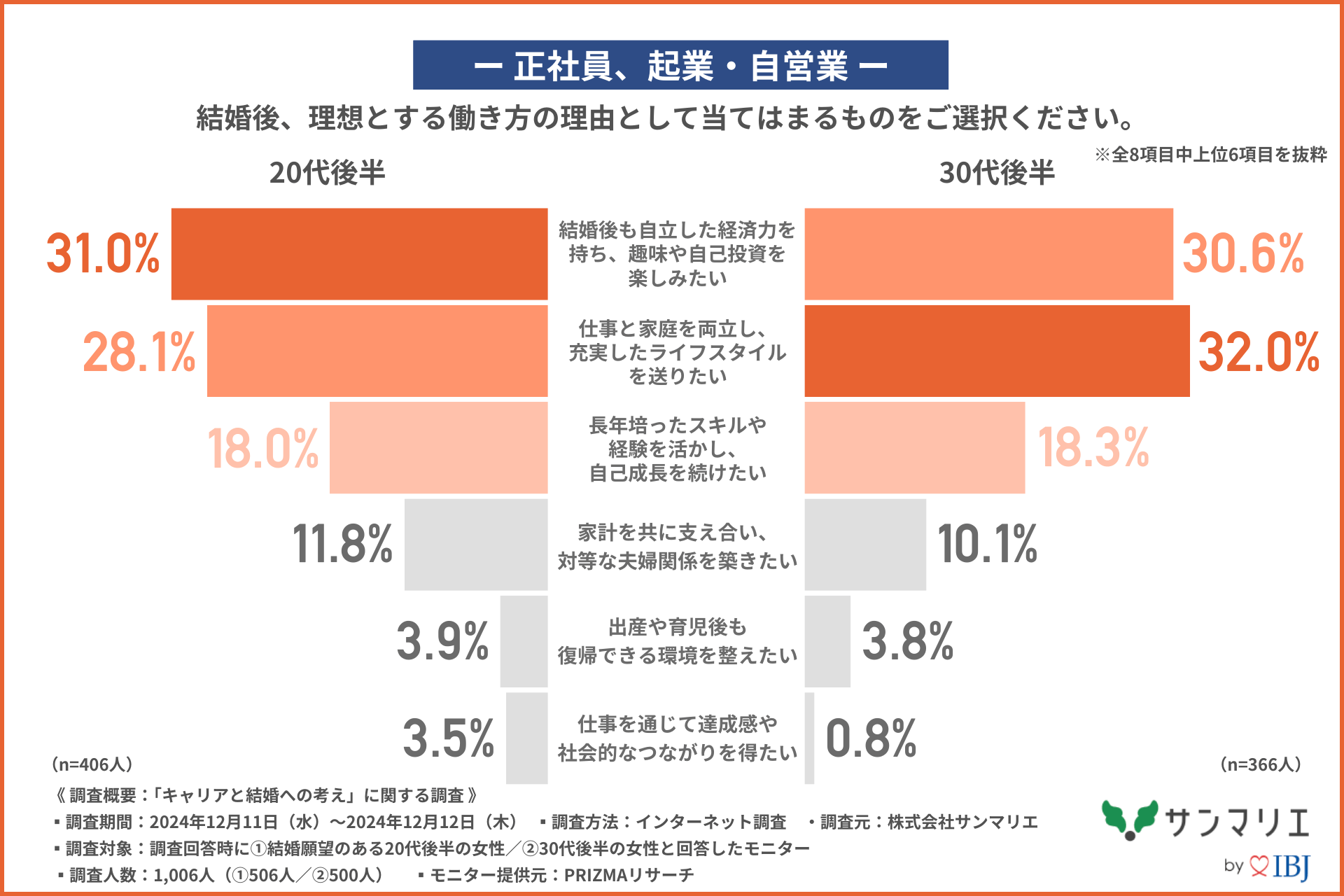 結婚後は、20代後半、30代後半の方ともに正社員として働きたいと思う方が多く、20代後半の方は自立した経済力を持ち趣味や自己投資を楽しみたい、30代後半の方は仕事と家庭を両立して充実したライフスタイルを送りたいと考えているようです。
