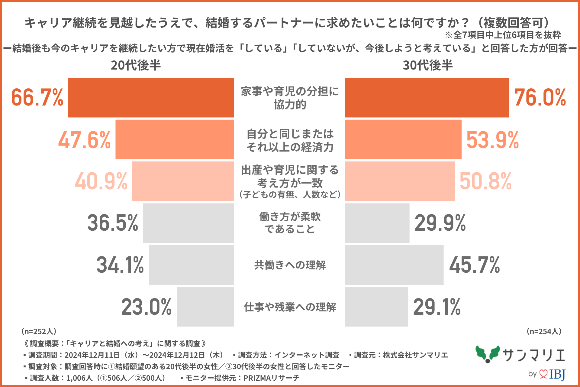 「キャリア継続を見越したうえで、結婚するパートナーに求めたいことは何ですか?(複数回答可)」と質問したところ、20代後半と30代後半の方で以下のような回答結果になりました。