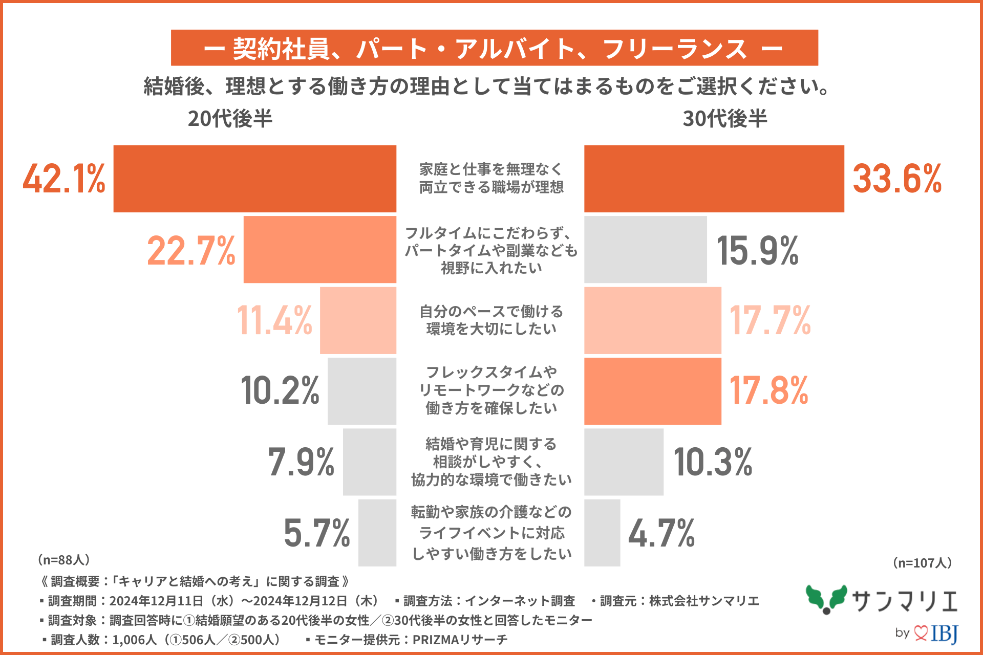 また、家庭と仕事を無理なく両立できる職場が理想であることから、結婚後は『契約社員』『パート・アルバイト』『フリーランスになる』を望む方もいることが示されました。