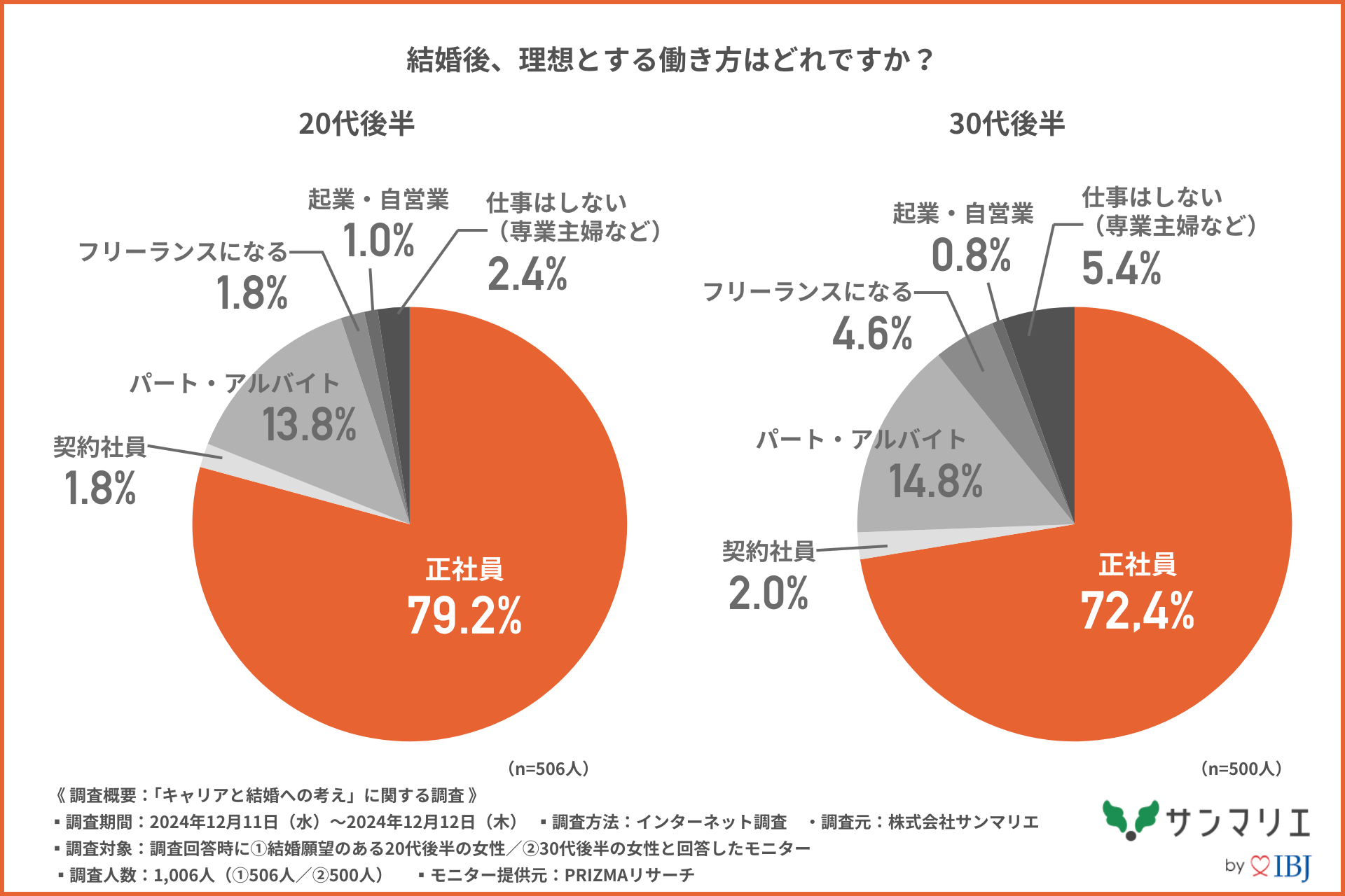 「結婚後、理想とする働き方はどれですか?」と質問したところ、20代後半の方は『正社員(79.2%)』、30代後半の方は『正社員(72.4%)』となりました。