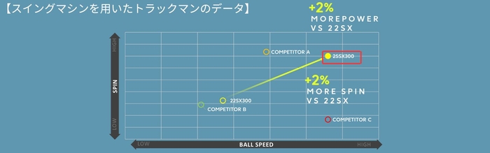 (2)スイングマシンによるトラックマンのデータでは、前モデルに比べパワー性能・スピン性能ともに2%向上しました。