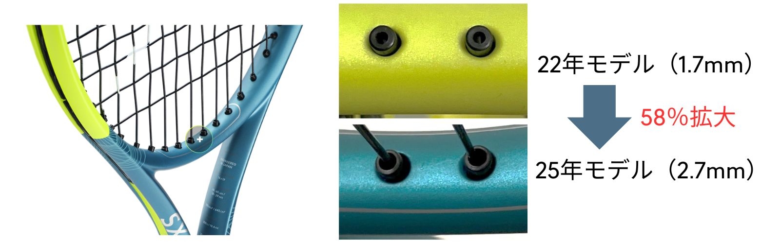 NEW「SX」シリーズは、新形状、新グロメットを採用しています。特に弾道を補正するグロメットの機能「スピンブースト・XT・グロメット」は、これまで12時部分の12個のグロメットホールのみ拡大してストリングの稼働方向をコントロールしていましたが、今回フェース6時部分の6個のグロメットホールも従来よりも58%拡大することで、さらにストリングの稼働域を拡大し、パワー性能、スピン性能、弾道補正に貢献します。これらの機能により、ストリングがよりたわみやすくなり、打球感の柔らかさも向上しています。