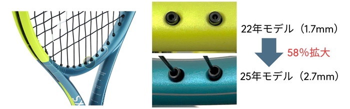 フェース6時部分:今回前作からの変更点として、フェース下部6個のグロメットホールを58%拡大(前作比)することで、ストリングの稼働域が拡大しました。これによりパワー性能、スピン性能、弾道補正機能が向上するとともに、打球感の柔らかさも実現しています。