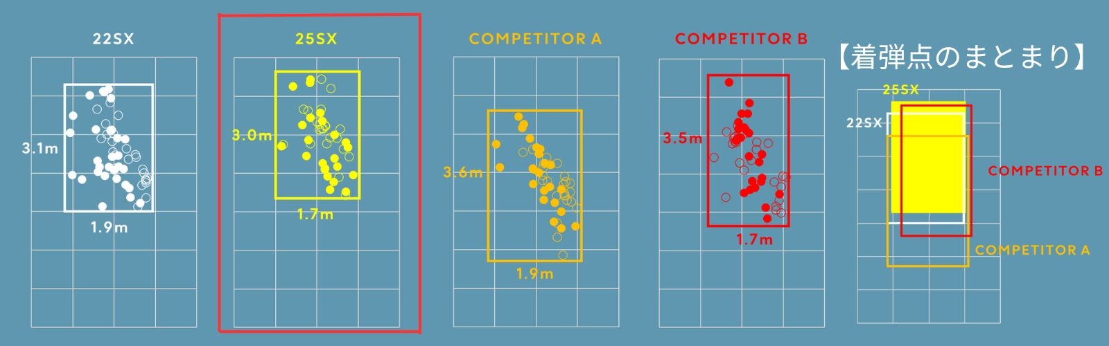 (1) スイングマシンによる着弾点計測では、NEW「SX」シリーズの着弾点が一番小さいエリアに集約されており、スイートエリア、オフセンターでの打球のコントロール性能、弾道の安定性が一番高くなりました。また着弾点が一番深いエリアに集約されていることから、攻撃的な打球になることがわかります。