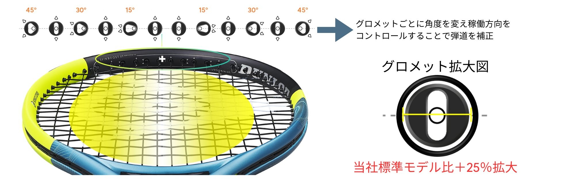 フェース12時部分:12個のグロメットホールを、当社標準グロメットよりも25%拡大し、ストリングの稼働方向をコントロールすることで、スイートエリアを外した際のパワー性能、スピン性能が向上し、弾道も補正されます。