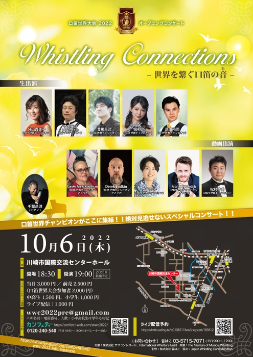 International Whistlers Guild主催、口笛世界大会 2022 オープニングコンサート『“Whistling Connections -世界を繋ぐ口笛の音(ね)”』が2022年10月6日 (木)に川崎市国際交流センターホール(神奈川県川崎市中原区木月祗園町2-2)にて開催されます。