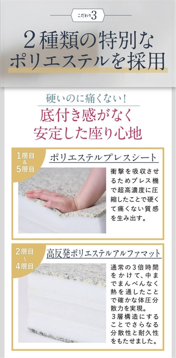③ 底付き感無しの座り心地!2種類の高反発ポリエステルを採用
