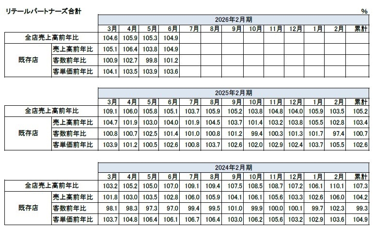株式会社リテールパートナーズ(本社:山口県/代表取締役社長:田中康男)の2025年6月の全店売上高前年比は104.9%であった。