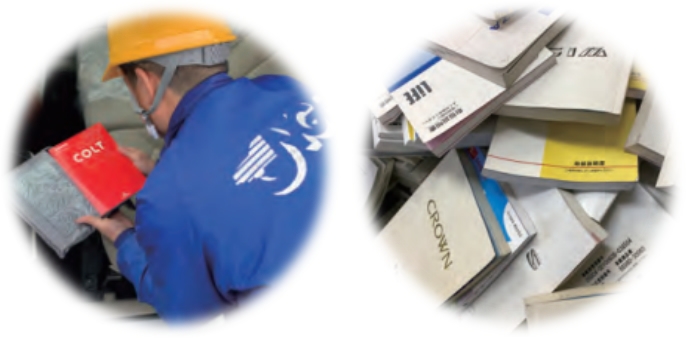 NGPが年間に引き取る廃車は60万台以上となりますが、自動車には、自動車の取扱い方法を詳しく解説した取扱説明書(200~500ページほどの冊子)が付属しており、これまで、取扱説明書は産業廃棄物として処理されていました。