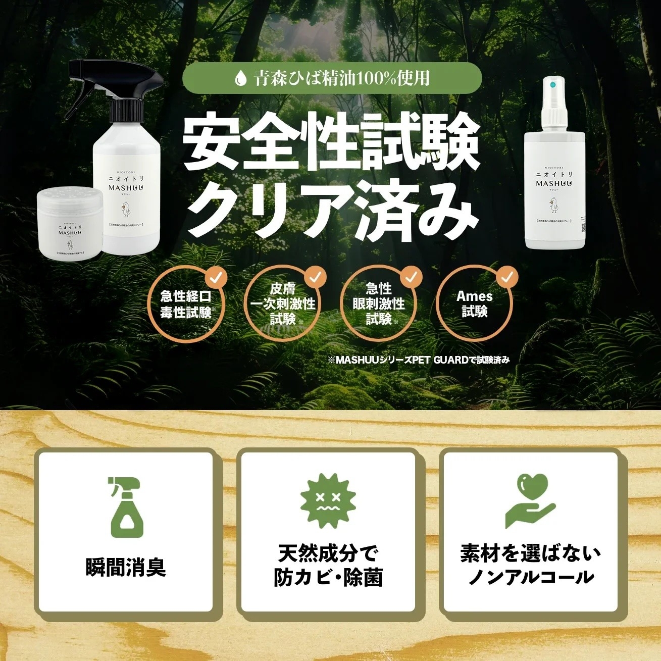 「ニオイトリMASHUU」は、天然の青森ひば精油を配合した消臭スプレーです。高齢化社会において関心の高い“ニオイ対策”を、自然由来のやさしさと高い消臭力でサポートします。人工香料を使わず、日常生活のさまざまなシーンで安心してご利用いただけることから、シニア世代に限らず幅広い方々に支持されています。当社は今回の協賛を契機に、青森ひばの価値を広くお伝えするとともに、今後も暮らしを快適にする製品づくりを進めてまいります。